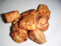 After an hour bathing in the marinade (the tofu, not me!) I dipped the bean curd chunks into the batter and fried them for a few minutes in hot vegetable oil. They sizzled gently and turned a beautiful golden brown. I scooped them out and drained them well, before tentatively biting into a piece. The kids were slightly wary, but after some gentle persuasion and the promise of another mention on my blog, they tried it. Mr O showed no such trepidation and ate a whole piece in one mouthful.