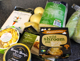 When Wayne arrived (in the cabbage van!) he offered to take my shopping into the kitchen for me, but I was happy for him to leave it in the hall. I unpacked the bags and found lots of goodies to try, including: Pieminister wild-shroom and asparagus pie, Lincolnshire Secret Sausages, Linda McCartney lentil and vegetable cottage pie, Booja-Booja Hunky Punky Chocolate (vegan) ice cream and Waitrose nut roast Wellingtons.